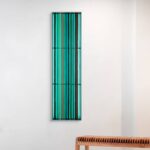 Central to Kang’s practice is her use of curved, translucent slate panels housed in rectangular frames. These materials, reminiscent of architectural windows, form a metaphorical “window of emotions,” blending art and space into a single narrative. The painted areas on the slate surfaces shift with the viewer’s perspective, creating dynamic optical illusions and evolving hues that stimulate memories and associations.