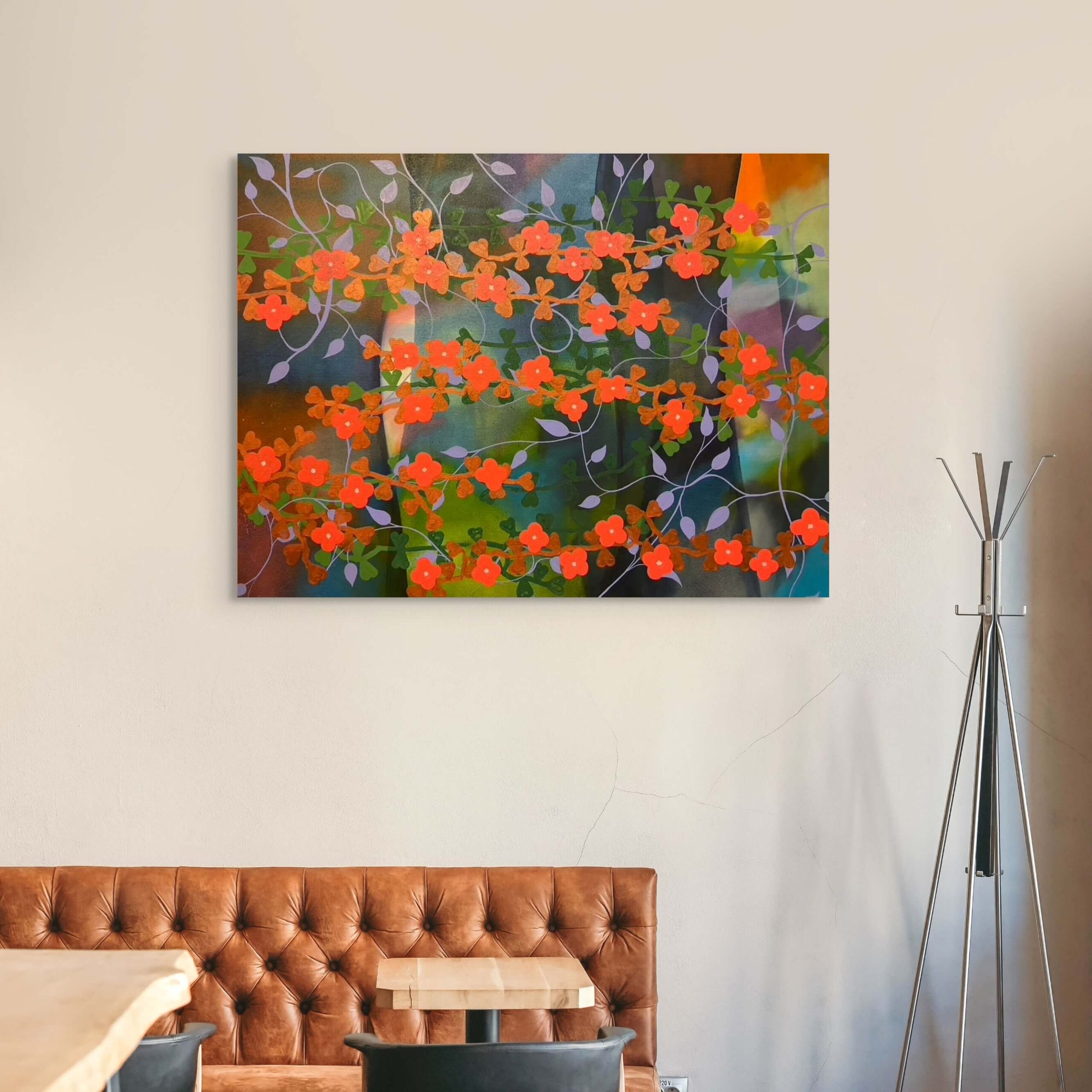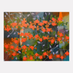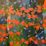 These paintings are improvised following an essentially abstract expressionist manner of working. And in many ways, conceptually they are abstractions as well. Yet clearly, recognizable motifs are employed. The overall trope is landscape, while emblematic botanical motifs representing simplified flowers, trees, and leaves permeate the compositions.