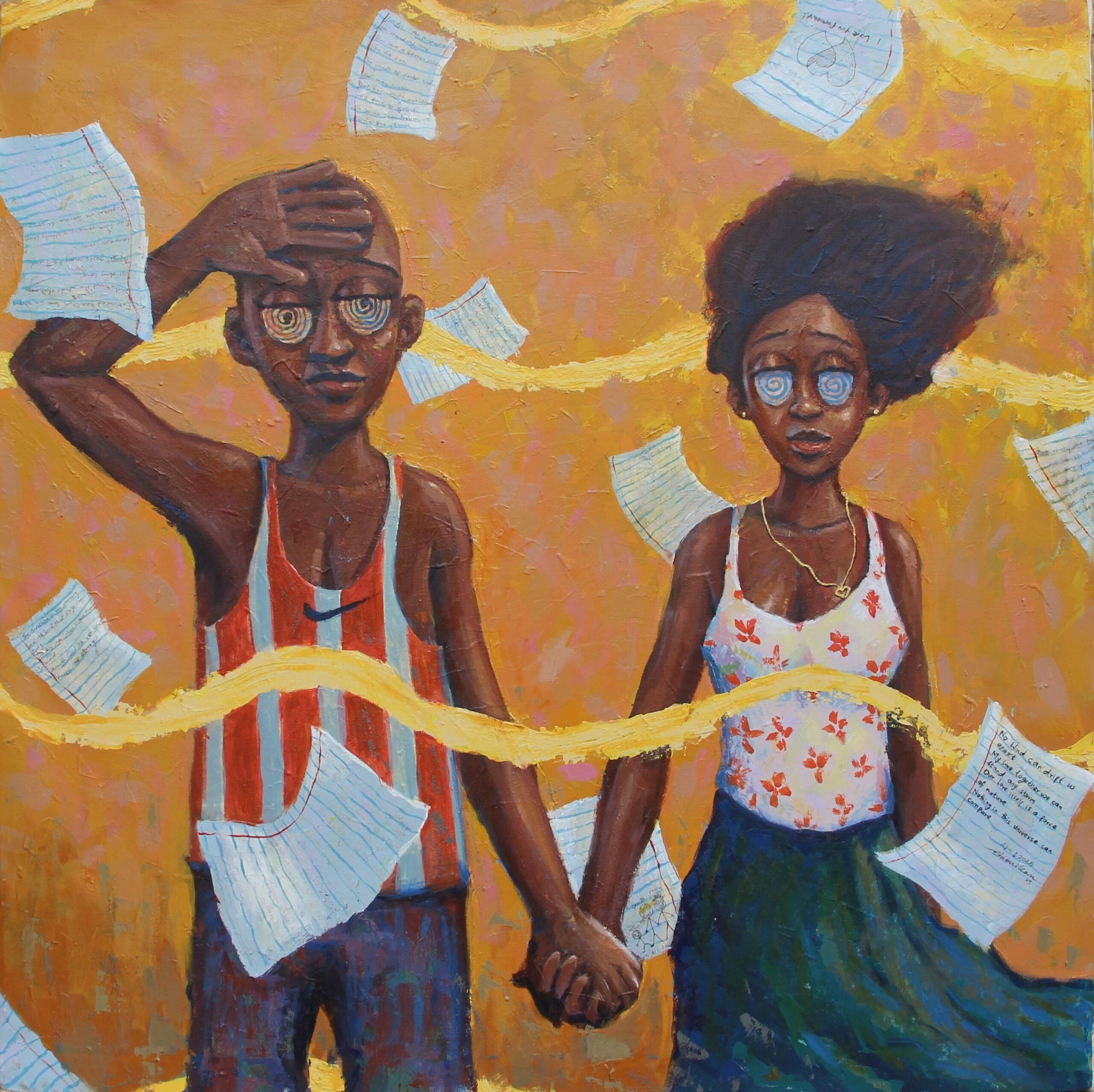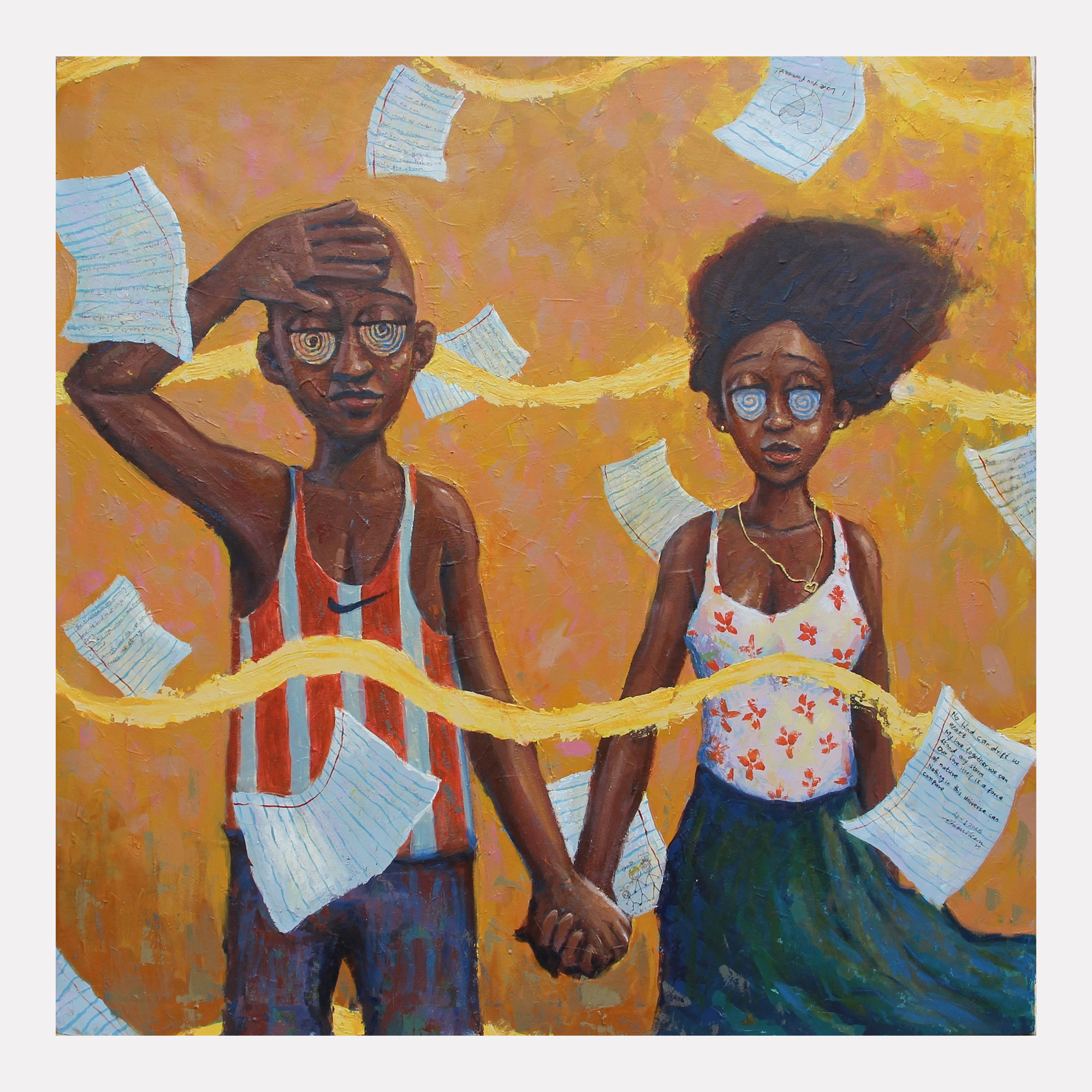 With a vibrant range of colors, my process involves repeatedly layering paint and sanding it down until I find flattened imagery which is radically different from the first layer. I selectively erase or enlarge certain features, painting each layer distinctly whether it be muscle, flesh, bone, or artificial implants. Through this process, I capture the tension within the liminal space between the figures, visualizing the interplay between personal struggles and broader social dynamics. This work represents the juxtaposition of clarity and anonymity, individuality and collectivity.