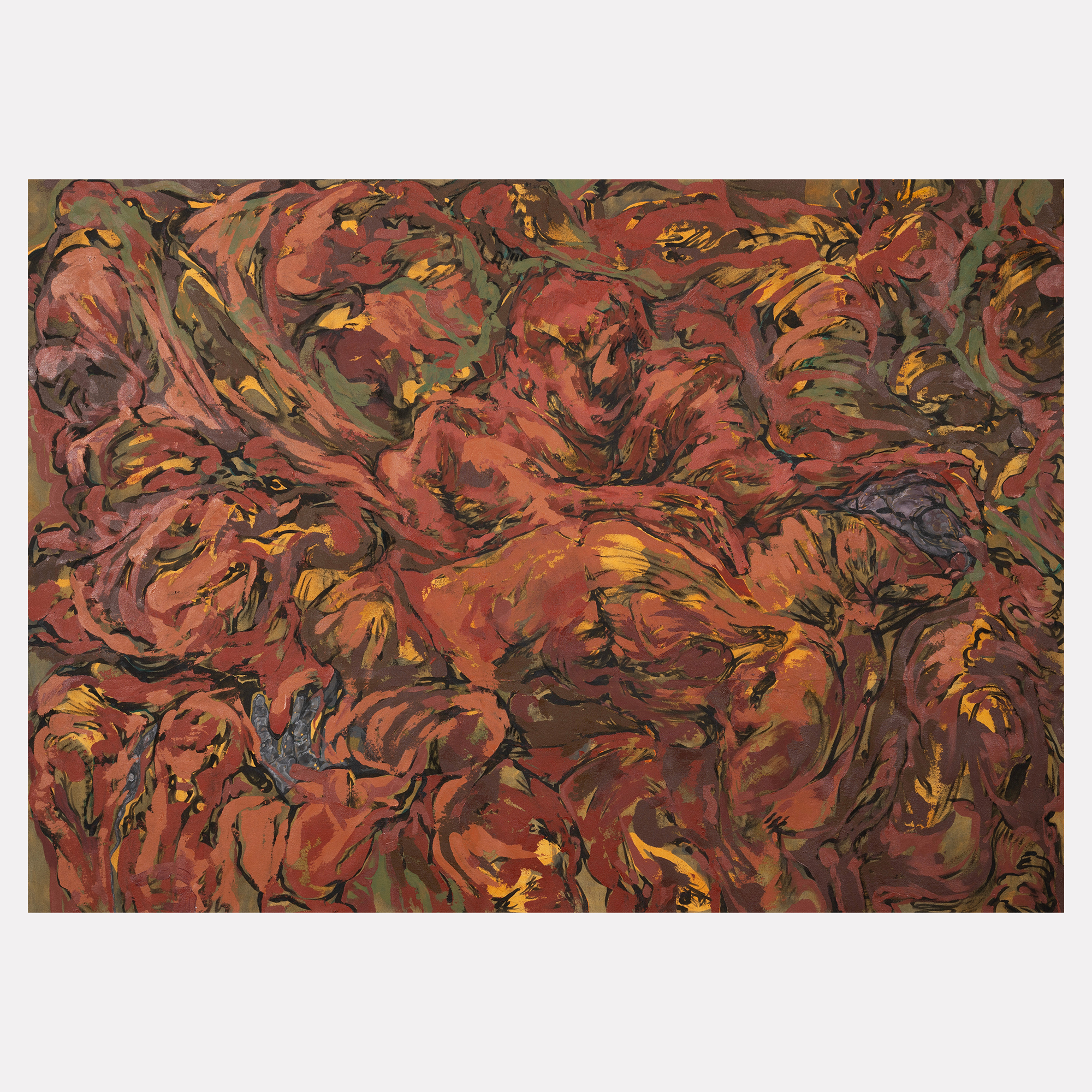 Abstracted and intertwined human figures float in an undefined space, losing their orientation as they dissolve into a chaotic composition. Body features, such as limbs or intestines, are sometimes blended, erased, enlarged, connected from one to another, or dissected into multiple layers.
