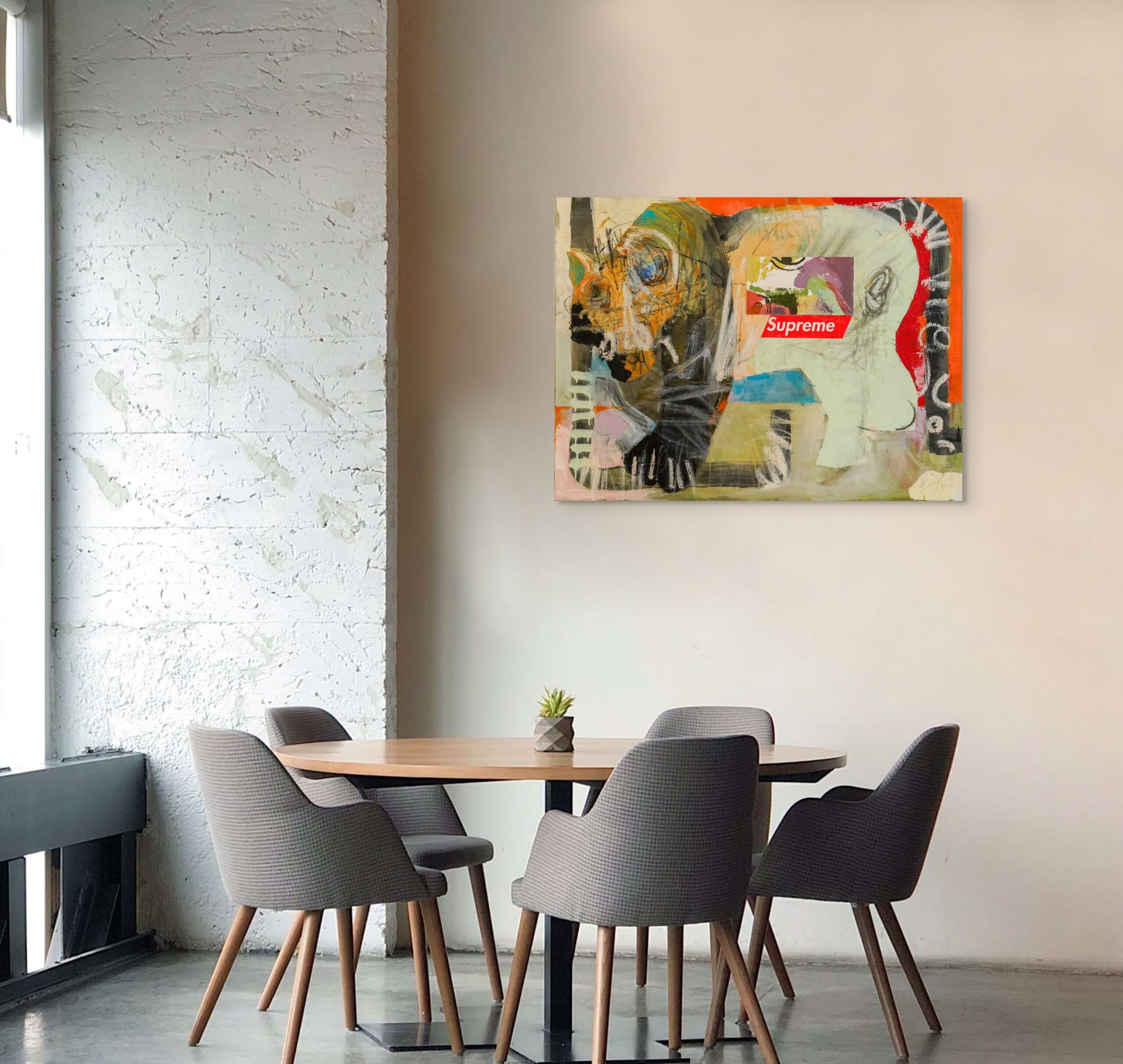 Joy Jongmin Kim (b. 1991) is a self-taught mixed media painter based in New York City. He was born in a small town in a southern province in South Korea and moved to Manhattan in 2014. Kim started drawing cartoons to entertain his friends in his early years, developing and changing his styles extensively with his audacious use of color and dynamic brushstrokes. He captures the moments from his daily life and travels, recreating the stories on canvas with an expressive style. Kim challenges the very traditional movements and techniques of institutional Modern and Contemporary Korean art. He was inspired by the emotionally moving techniques of Pablo Picasso and Jean-Michel Basquiat, referencing Afro-American culture and contemporary street art.