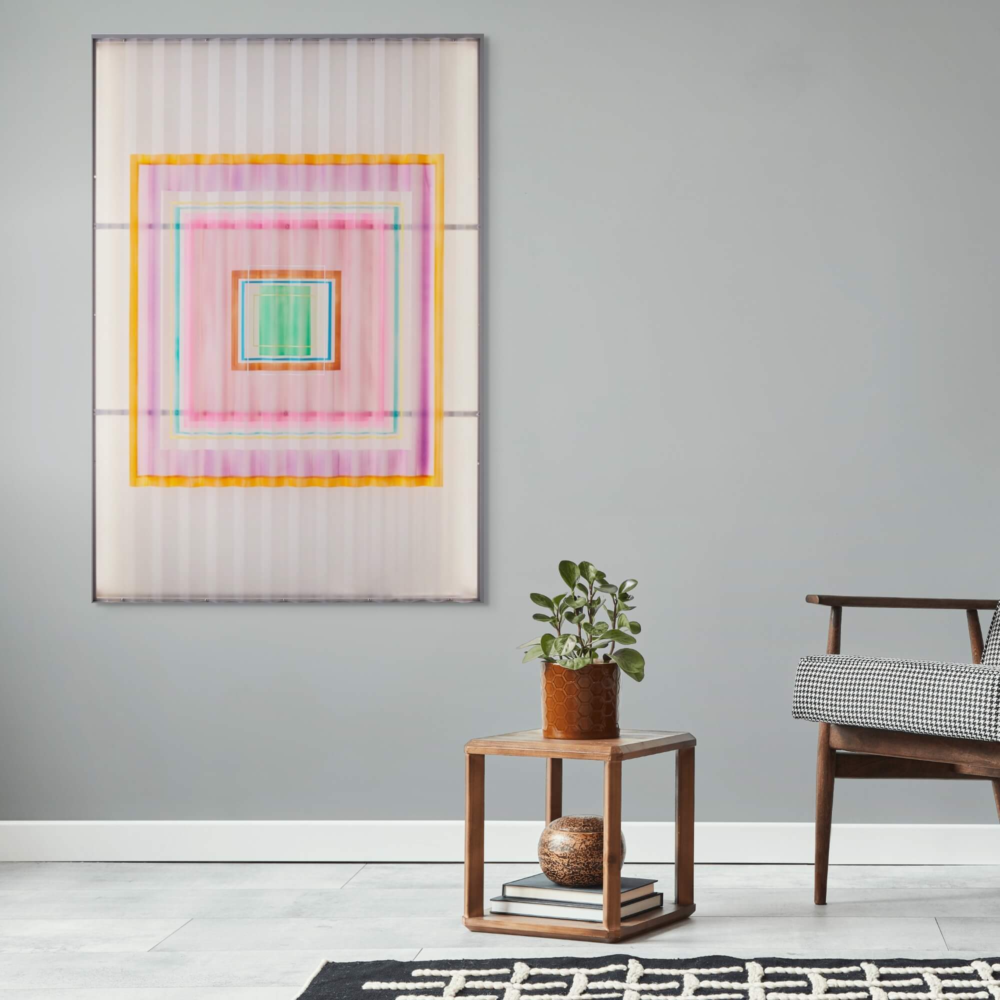 Central to Kang’s practice is her use of curved, translucent slate panels housed in rectangular frames. These materials, reminiscent of architectural windows, form a metaphorical “window of emotions,” blending art and space into a single narrative. The painted areas on the slate surfaces shift with the viewer’s perspective, creating dynamic optical illusions and evolving hues that stimulate memories and associations.